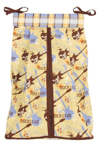 Keep your diapers organized, concealed and close at hand with this Rockstar diaper stacker by Trend Lab. Diaper stacker features a brown, blue, orange and tan guitar scatterprint accented by a matching plaid print top and brown ultrasuede trim. Ties allow for easy attachment to most dressers and changing tables. Measures 12" x 8" x 20 1/4" and holds up to three dozen diapers. This diaper stacker coordinates with the Rockstar collection.Features include: