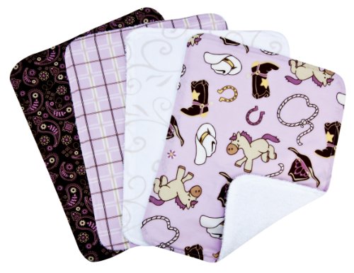 Keep messes to a minimum with this stylish Rodeo Princess Burp Cloth Set by Trend Lab. Set features four burp cloths each with fun, modern printed cotton on the front and soft terry on the back. Burp cloth patterns include: one cowgirl themed scatter print in chocolate, maple, cream and violet with touches of dreamsicle orange and caramel on a soft orchid background, one chocolate bandana print with violet and maple accents, one plaid print in chocolate, sand and cream on a soft orchid background and one vine print in pewter and white. Each burp cloth measures 13" x 10".